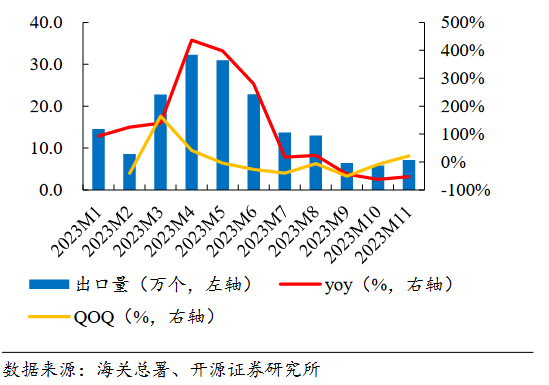 随着当地能源危机的缓解,此前过多发往欧洲地区的户储产品形成了较大规模的库存,根据海关数据统计,国内发往欧洲贸易中转站荷兰的逆变器产品在2023年1-10月之间总体呈下降趋势,不过在11月国内对荷兰逆变器出货数量达23.3万个,自8月以来首次环比转正。