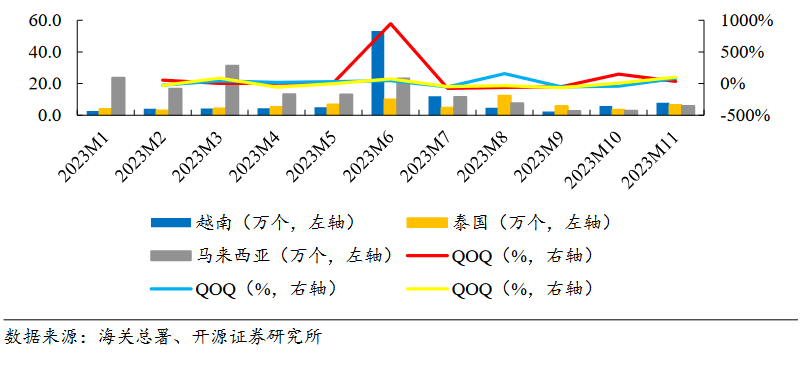 2023年6月,国内对越南、泰国和马来西亚分别实现逆变器出口53.3、10.1和23.3万个,分别环比增长945.3%、46.3%与75.2%,东南亚地区储能市场需求自6月夏天开始实现了大幅增长。其主要原因系当地脆弱的电网在极端气候发生与可再生能源装机占比提升的情况下,其不稳定性大幅加强,对储能系统需求呈现出相对刚性。