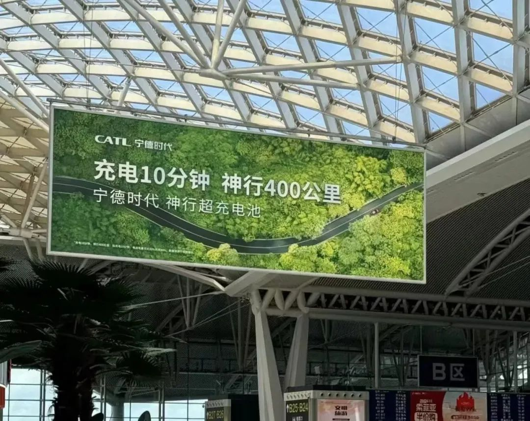 从去年8月发布“平价”的磷酸铁锂神行超充电池后,宁德时代的营销就走起了“亲民”路线——在全国多地的机场、高铁站,投放了大量的户外、站厅内广告,商旅行人很难不注意到宁德时代的广告。