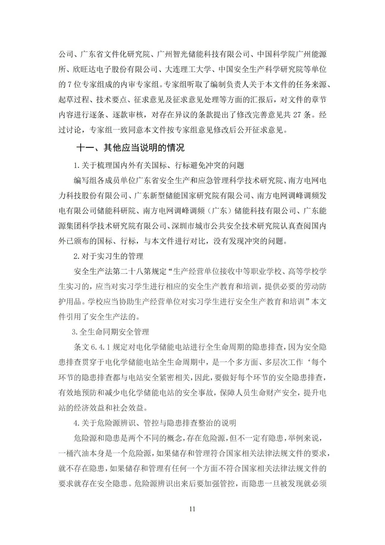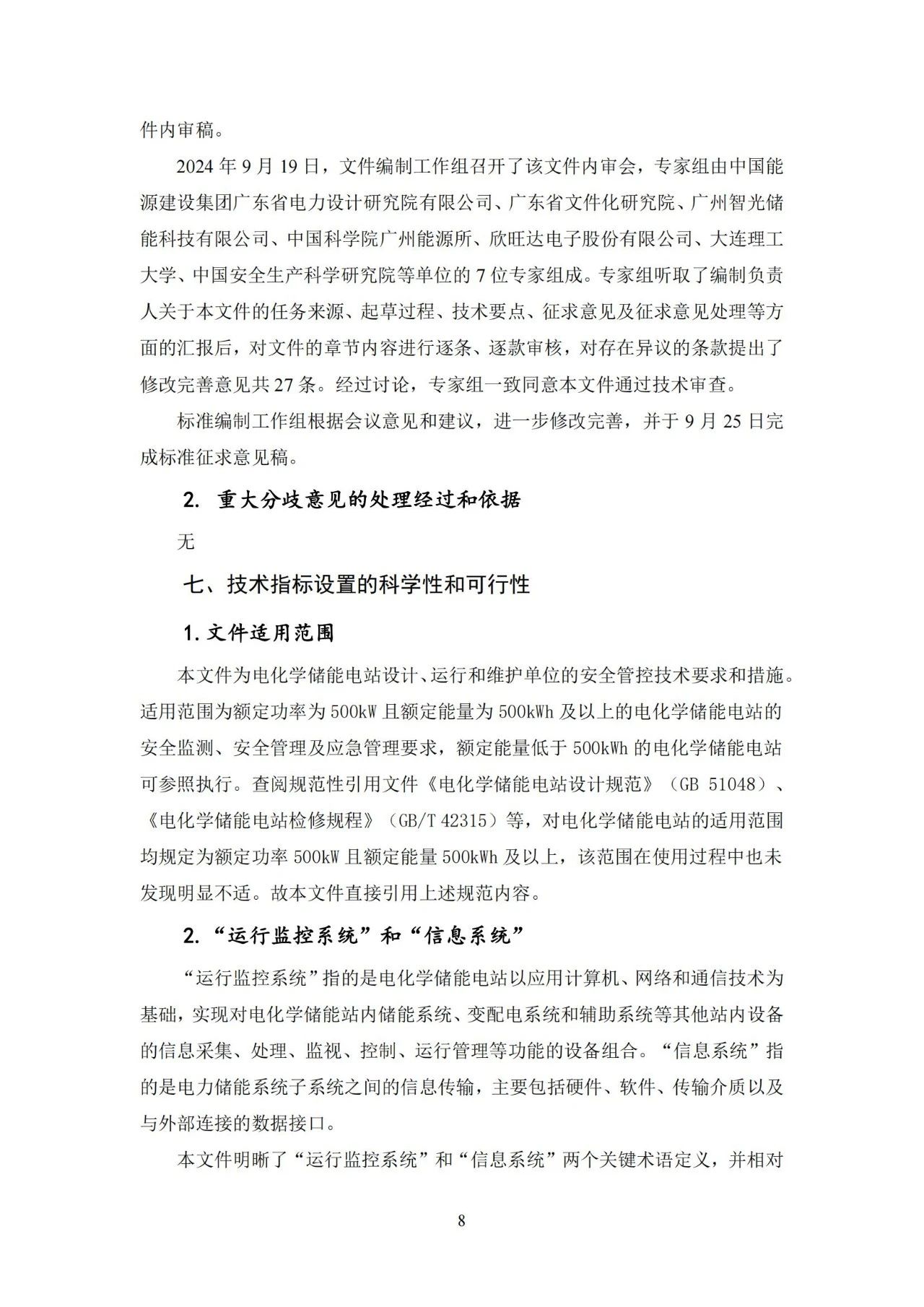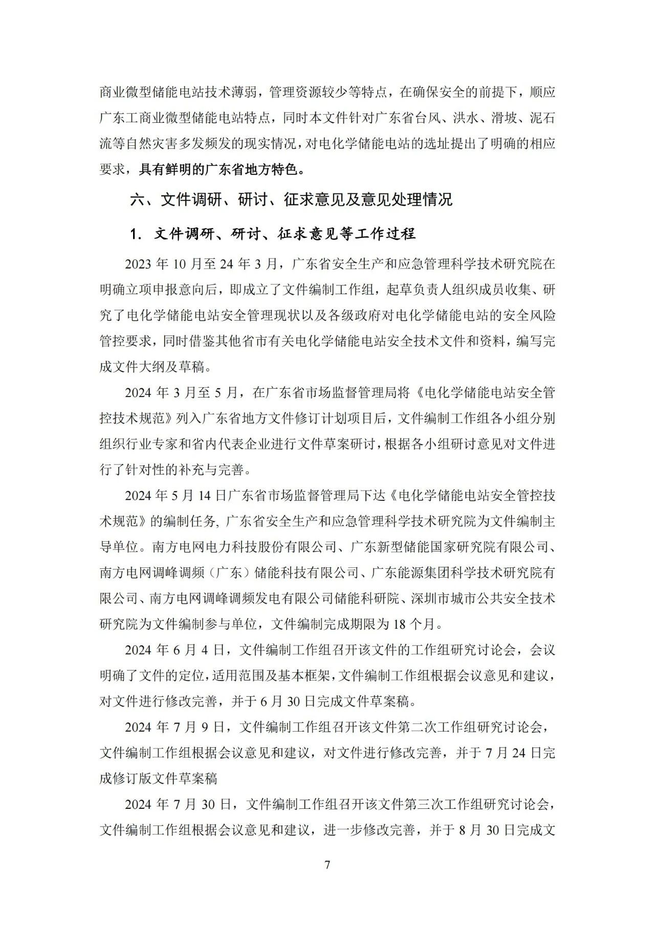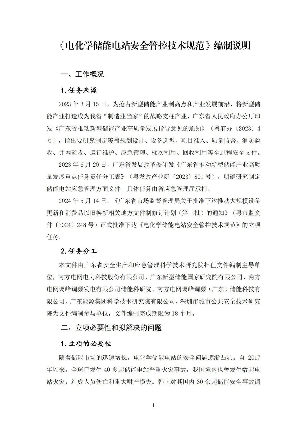 根据《广东省市场监督管理局关于批准下达推动大规模设备更新和消费品以旧换新相关地方标准制修订计划(第三批)的通知》(粤市监标准〔2024〕248号)的要求,由广东省安全生产和应急管理科学技术研究院牵头组成的标准起草小组在立项资料标准草案基础上,经过近半年的调查研究、起草讨论、单位内审,修改完善后形成了地方标准《电化学储能电站安全管控技术规范(征求意见稿)》(见附件1)。