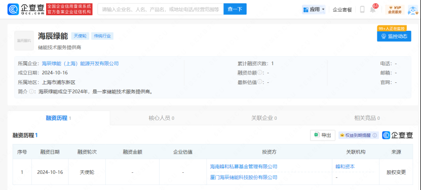 企查查显示,投资方为海南峰和私募基金管理有限公司、厦门海辰储能科技股份有限公司,融资金额与估值未披露。