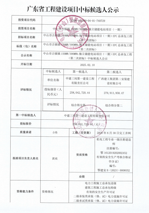 近日,中山市古镇镇150MW/300MWh独立储能电站项目(一期) 、宁夏通久新能源经济开发区100MW/200MWh储能电站工程EPC总承包中标候选人公示。