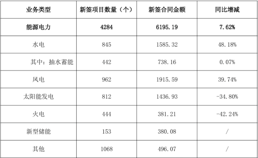 在细分业务中,能源电力业务新签项目数量4284个,新签合同金额6195.19亿元,同比增长7.62%。其中,新型储能新签项目数量153个,合同金额380.08亿元;水资源与环境业务新签项目数量779个,新签合同金额896.01亿元,同比减少26.77%;城市建设与基础设施新签项目数量960个,新签合同金额2019.85亿元,同比减少6.77%。