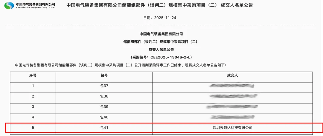 2025年11月24日,深圳天邦达科技有限公司凭借卓越的技术实力与可靠的产品品质,成功中标中国电气装备集团有限公司“储能组部件(谈判二)规模集中采购项目(二)”,该项目储能BMS总装机量超GWh。此次中标标志着天邦达在BMS领域的技术实力再获得重量级央企认可,展现了公司在储能核心技术领域的深厚积淀。
