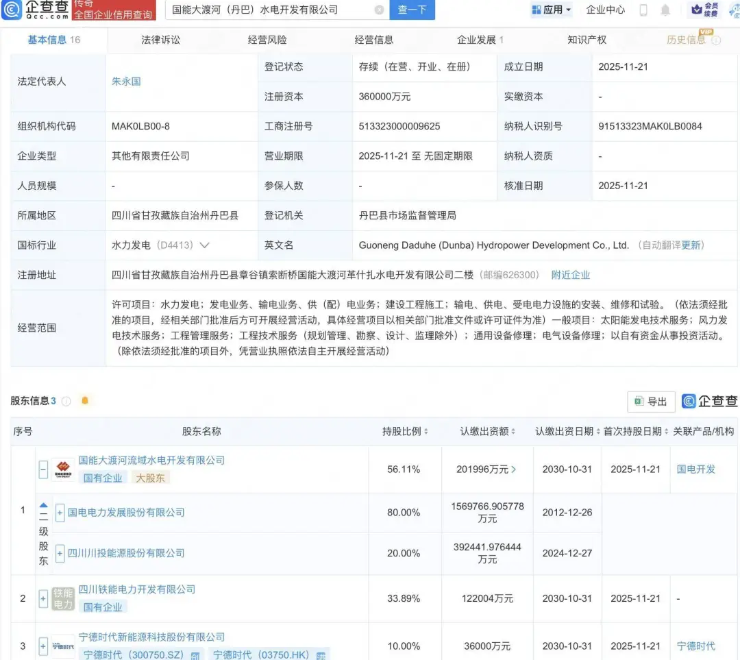 国电电力携手宁德时代 36 亿开发大渡河水电