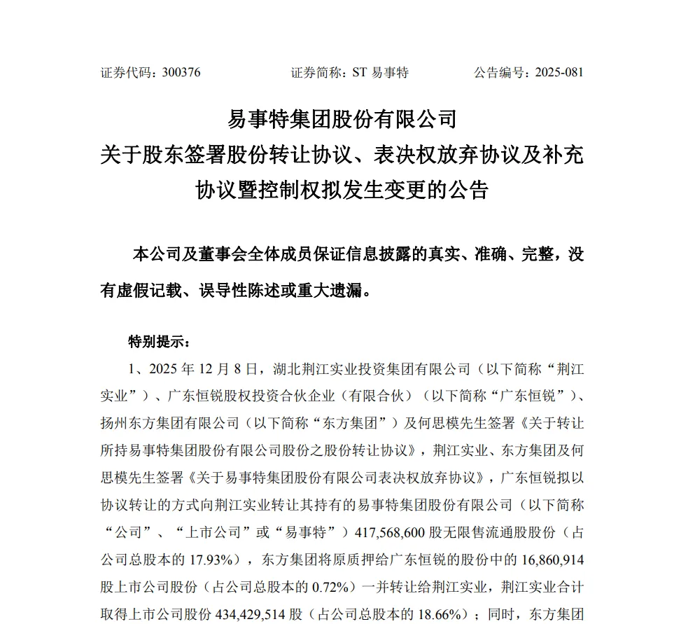 12月8日,易事特发布公告称,公司控制权拟发生变更。湖北荆江实业投资集团有限公司(“荆江实业”)拟斥资约24.37亿元受让公司股份,并成为公司新的控股股东。