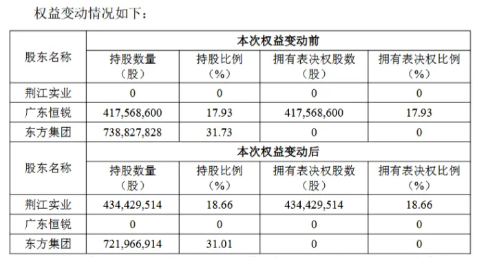 公告主要内容包括,广东恒锐拟将其持有公司的4.18亿股(占公司总股本的17.93%)通过协议转让方式转让给湖北荆江实业投资集团有限公司(简称“荆江实业”),东方集团拟将其质押给广东恒锐的股份中的1686.09万股公司股份(占公司总股本的0.72%)一并转让给荆江实业。本次股份转让的转让价格为5.61元/股,股份转让总价款共计24.37亿元。同时,东方集团不可撤销地放弃其持有的公司全部股份(7.22亿股,占公司总股本的31.01%)的表决权。