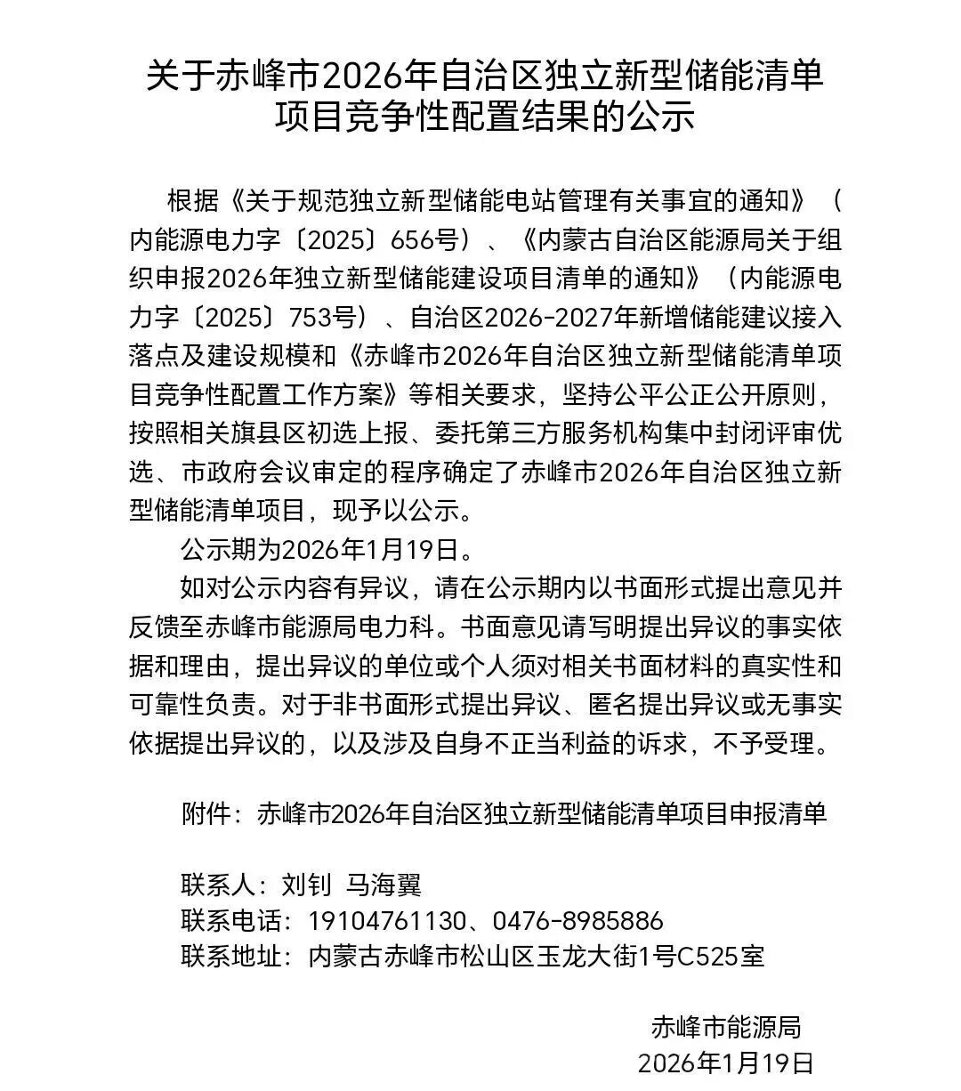 1月18日,赤峰市能源局发布《关于赤峰市2026年自治区独立新型储能清单项目竞争性配置结果的公示》。本次公布4个项目列入赤峰市独立新能源储能清单,总规模为1000MW/4000MWh。
