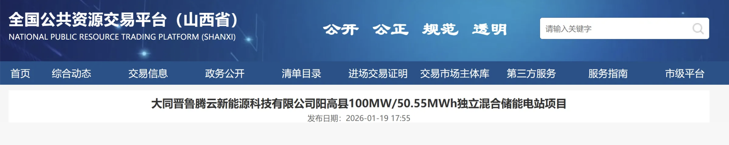 《大同晋鲁腾云新能源科技有限公司阳高县100MW/50.55MWh独立混合储能电站项目》显示,此项目建设地点为山西省大同市阳高县龙泉工业园区。此次招标由大同晋鲁腾云新能源科技有限公司主导,覆盖项目勘察、设计、施工、监理、主要设备、重要材料环节。
