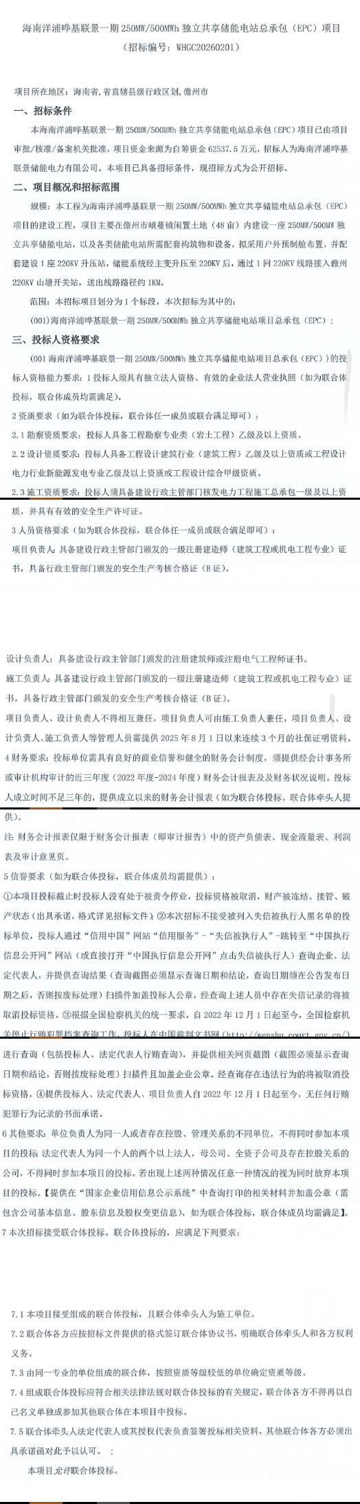 2026年1月23日,海南洋浦哗基联景一期250MW/500MWh独立共享储能电站总承包(EPC)项目发布招标公告,项目资金来源为自筹资金62537.5万元,约合单价1.25元/Wh。