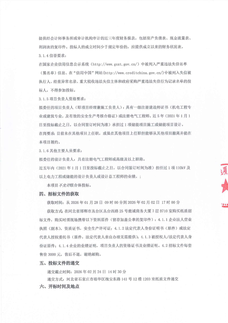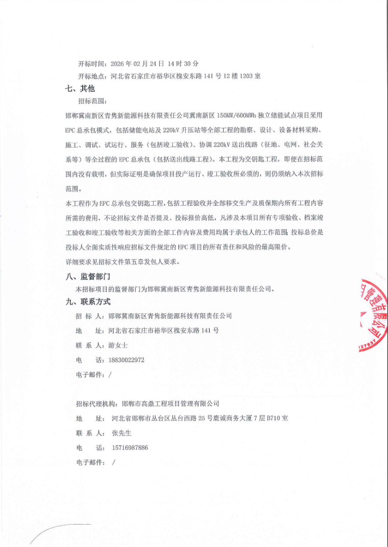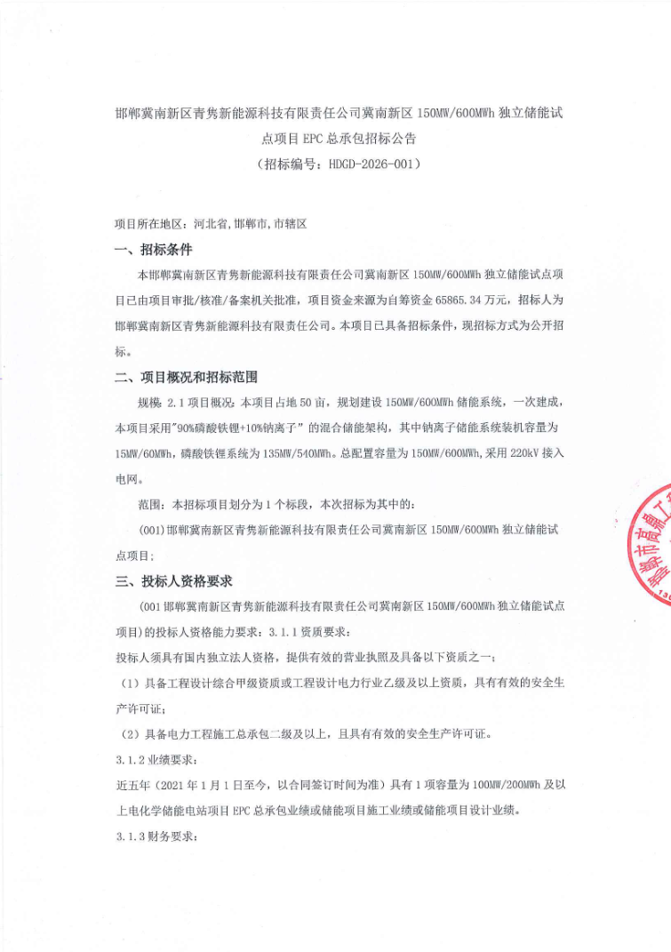 据了解,1月27日,邯郸冀南新区青隽新能源科技有限责任公司冀南新区150MW/600MWh独立储能试点项目EPC总承包招标公告发布。