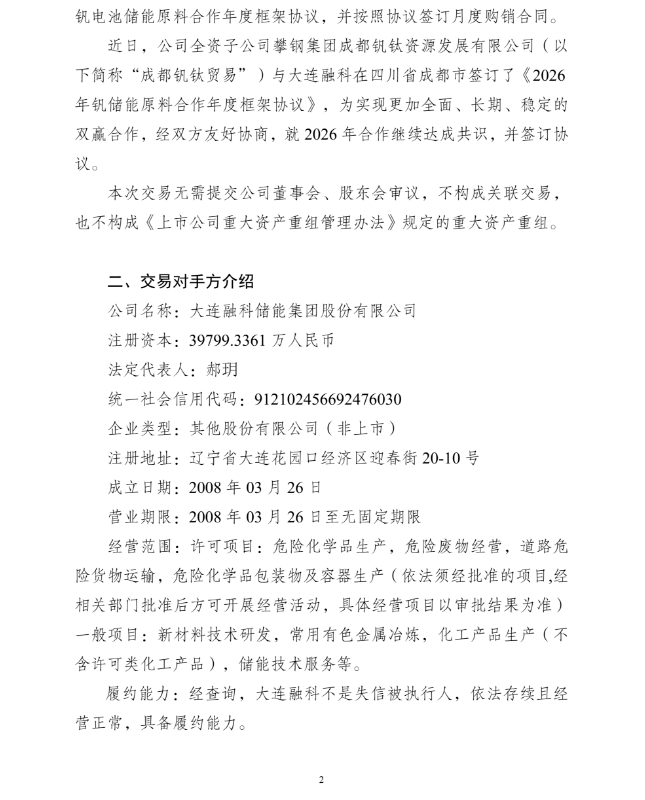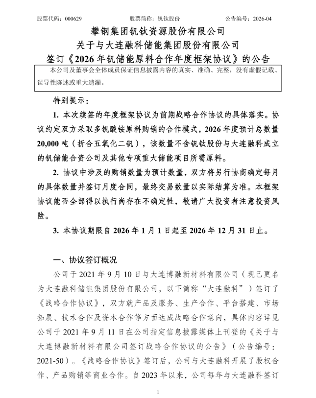 公告显示,近日钒钛股份全资子公司攀钢集团成都钒钛资源发展有限公司(以下简称“成都钒钛贸易”)与大连融科在四川省成都市签订了《2026年钒储能原料合作年度框架协议》,为实现更加全面、长期、稳定的双赢合作,经双方友好协商,就2026年合作继续达成共识,并签订协议。
