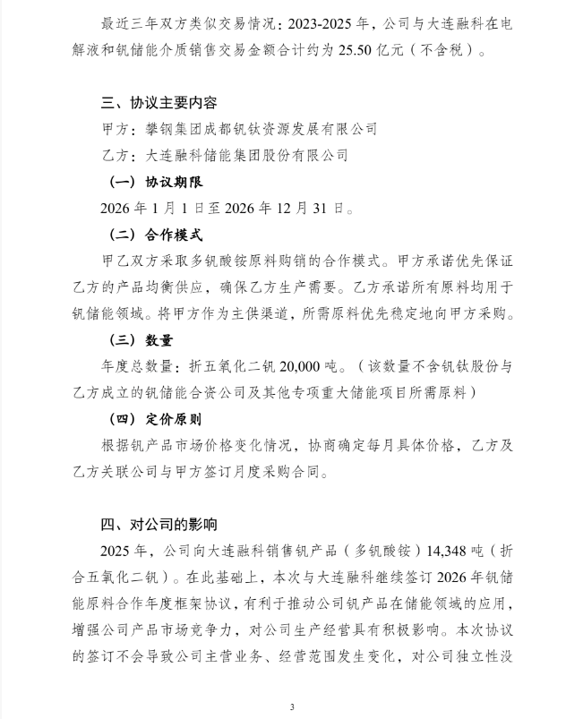 1.本次续签的年度框架协议为前期战略合作协议的具体落实。协议约定双方采取多钒酸铵原料购销的合作模式,2026年度预计总数量20,000吨(折合五氧化二钒),该数量不含钒钛股份与大连融科成立的钒储能合资公司及其他专项重大储能项目所需原料。