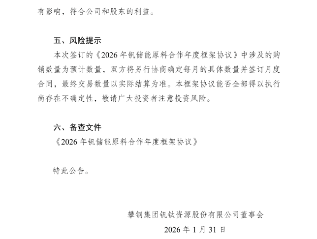 1月31日,钒钛股份披露关于与大连融科储能集团股份有限公司签订《2026年钒储能原料合作年度框架协议》的公告。
