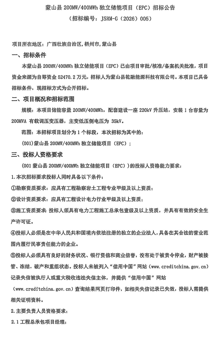 2月4日,蒙山县乾融能源科技有限公司发布蒙山县200MWW/400MWh独立储能项目EPC招标公告,项目总投资52470.2万元,合单价1.31元/Wh。