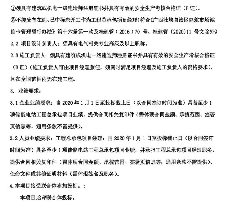 项目要求投标人六年内具备至少1项储能电站工程总承包项目业绩;工程总承包项目经理六年内具备至少1项储能电站工程总承包项目业绩,并承担工程总承包项目经理职务。