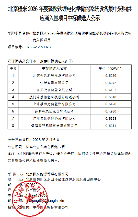 2月7日,北京疆来2026年度磷酸铁锂电化学储能系统设备集中采购供应商入围项目中标候选人公示。