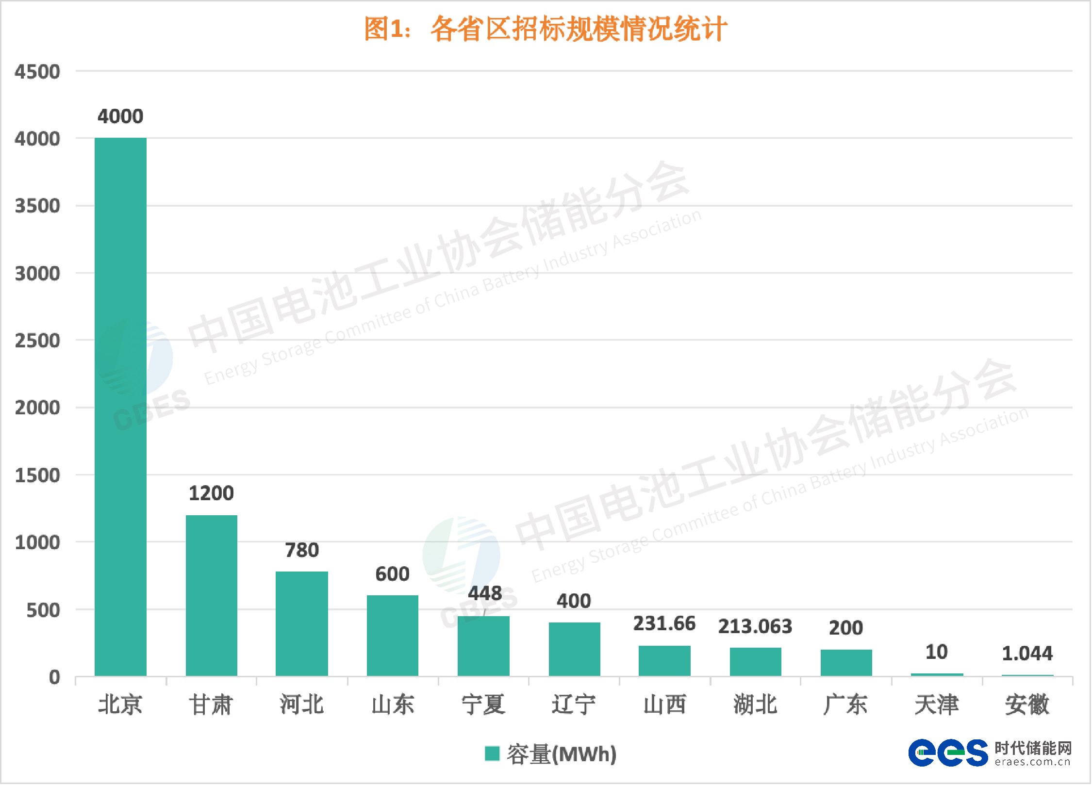 各省区招标规模情况,TOP5分别是:北京4000MWh;甘肃1200MWh;河北780MWh;山东600MWh;宁夏448MWh。