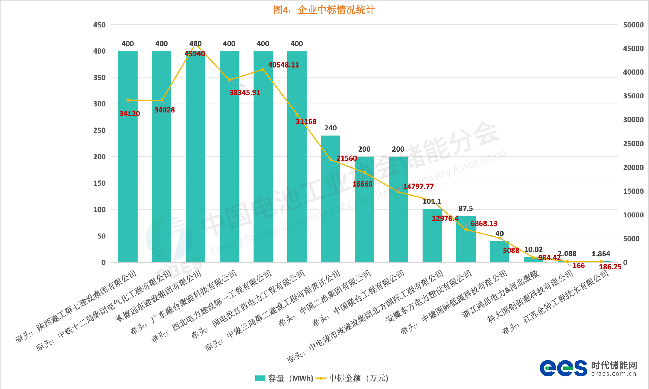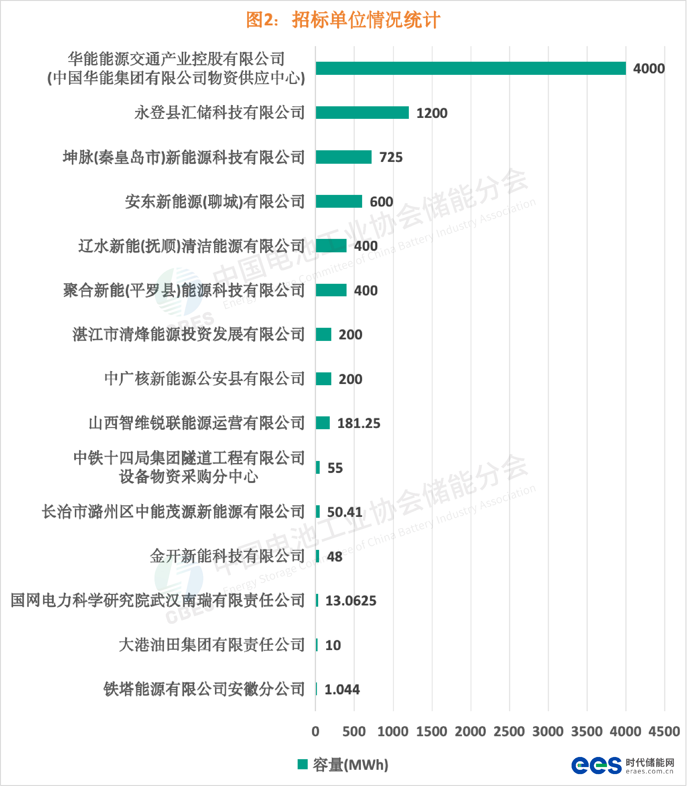 招标单位规模情况统计,TOP5分别是:华能能源交通产业控股有限公司(中国华能集团有限公司物资供应中心)4000MWh;永登县汇储科技有限公司1200MWh;坤脉(秦皇岛市)新能源科技有限公司725MWh;安东新能源(聊城)有限公司600MWh;辽水新能(抚顺)清洁能源有限公司、聚合新能(平罗县)能源科技有限公司并列第五,均为400MWh。