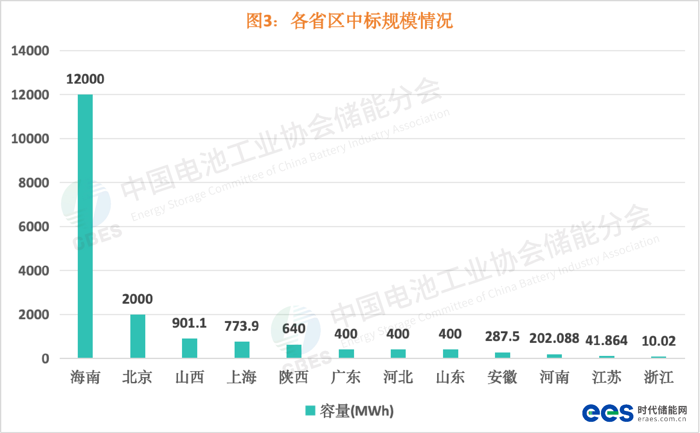 各省区中标规模情况,TOP5分别是:海南12000MWh;北京2000MWh;山西901.1MWh;上海773.9MWh;陕西640MWh。