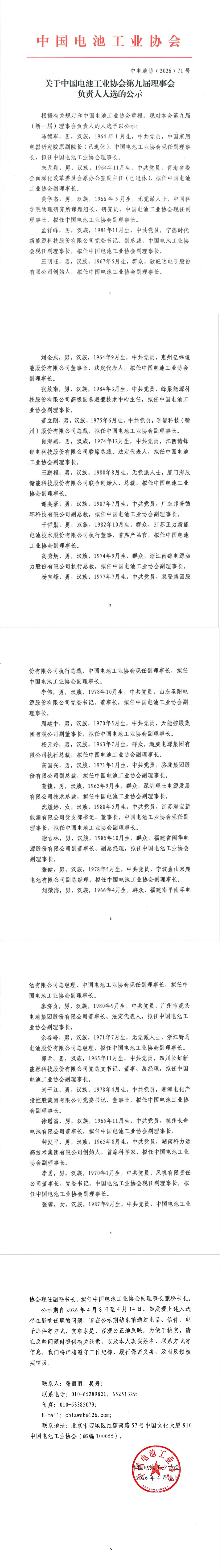 根据有关规定和中国电池工业协会章程,现对本会第九届(新一届)理事会负责人的人选予以公示: