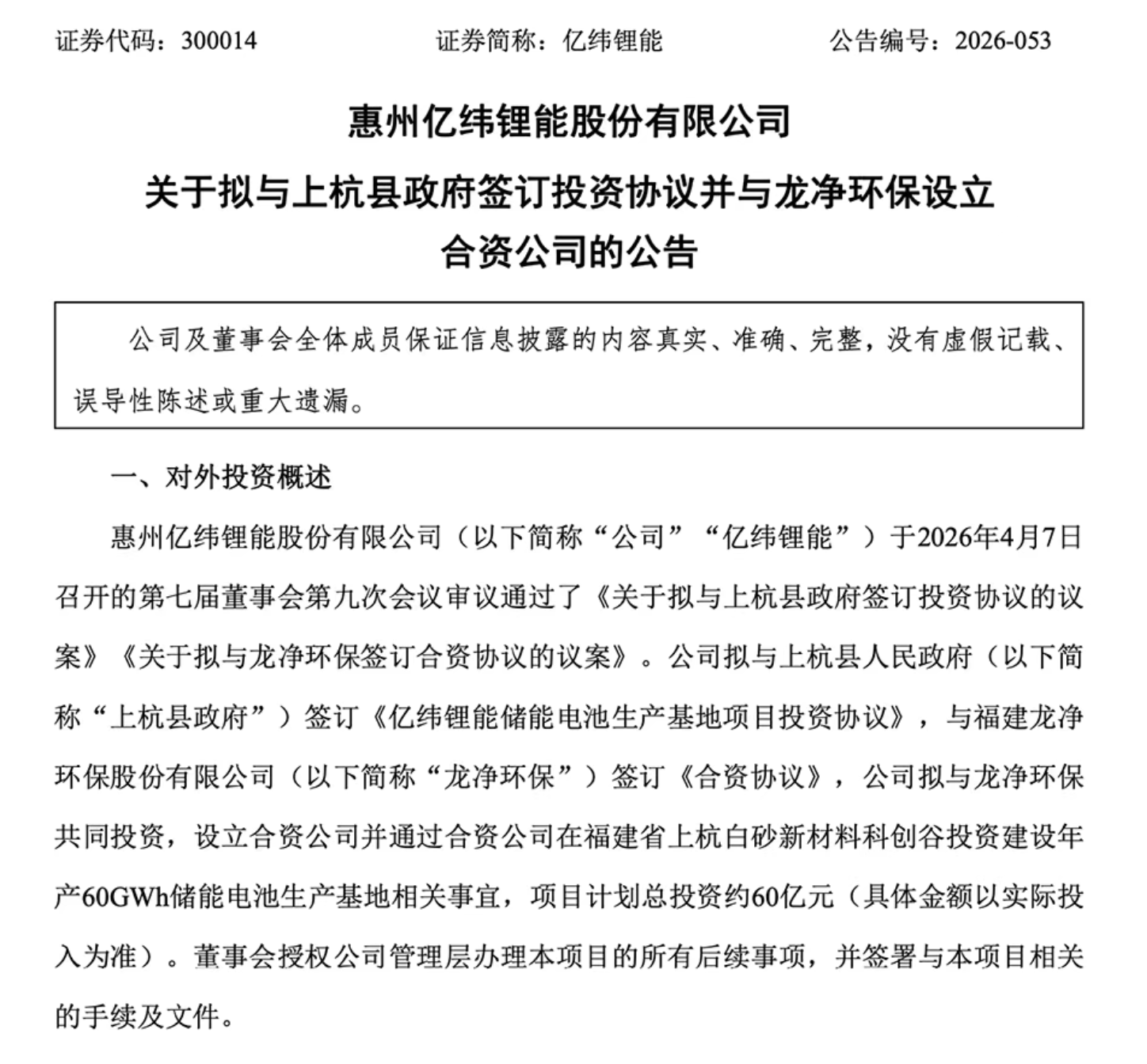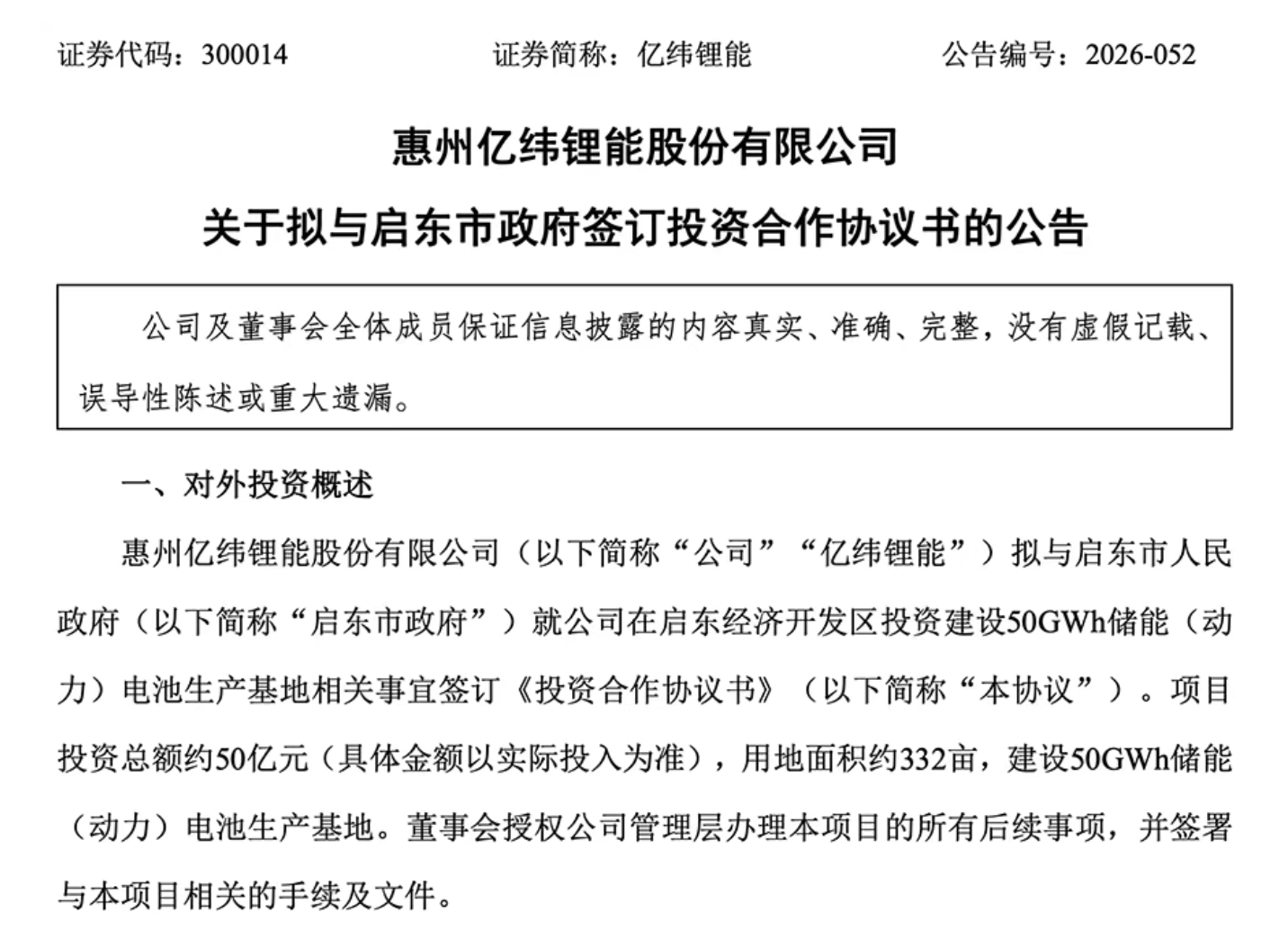 在江苏启东,亿纬锂能拟与当地政府签署协议,在启东经济开发区建设50GWh储能(动力)电池生产基地,项目总投资约50亿元,占地约332亩。该地块需通过招拍挂程序取得,存在土地获取时间和结果的不确定性。亿纬锂能提示,项目后续还可能受宏观经济、行业政策及市场变化影响,存在建设延期或收益不及预期的风险。