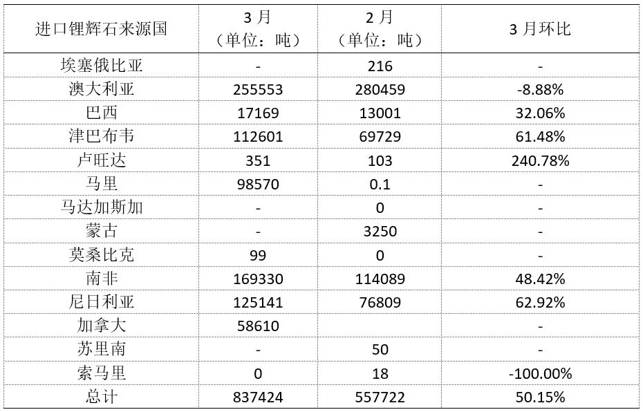 3月中国锂辉石进口量再创新高,达83.74万实物吨